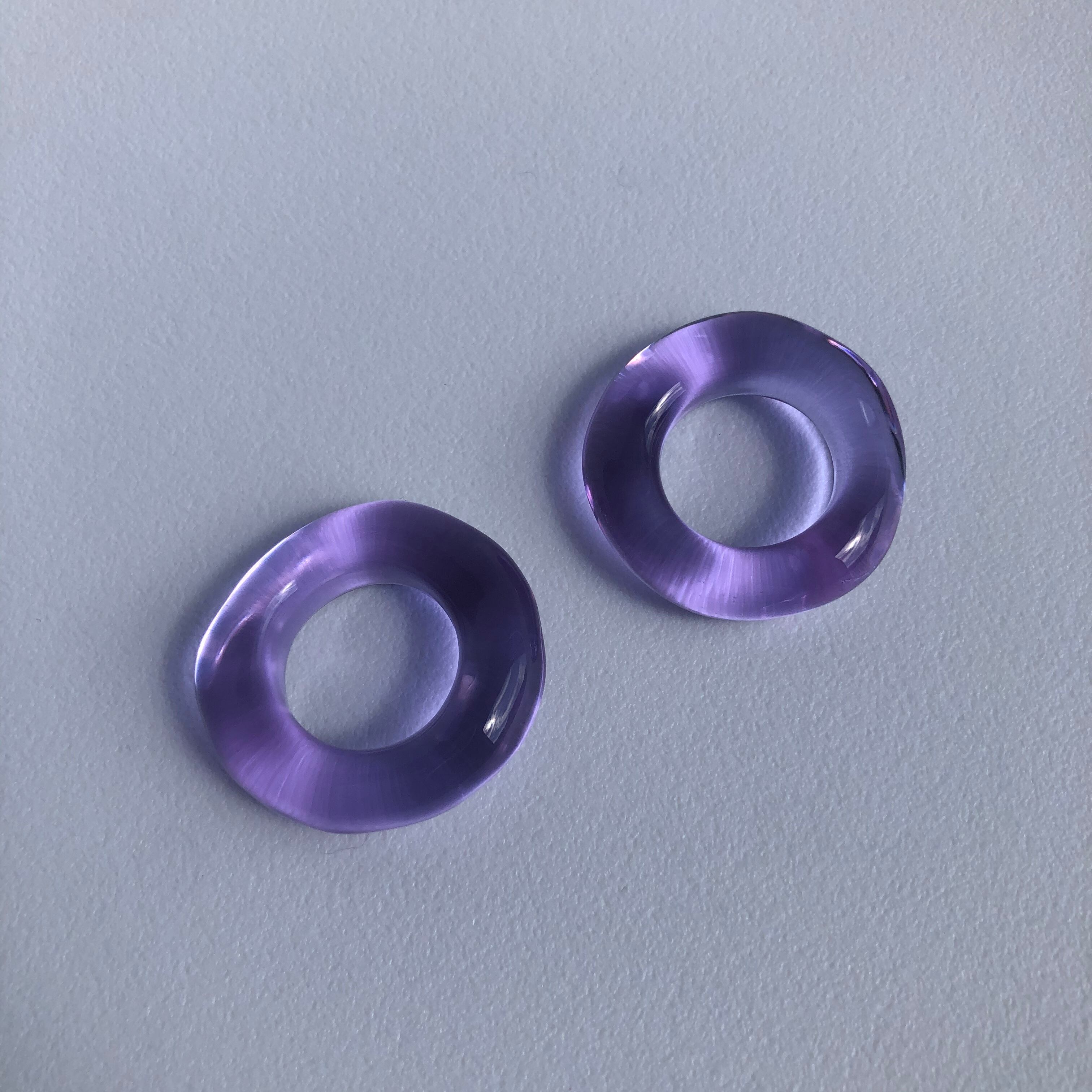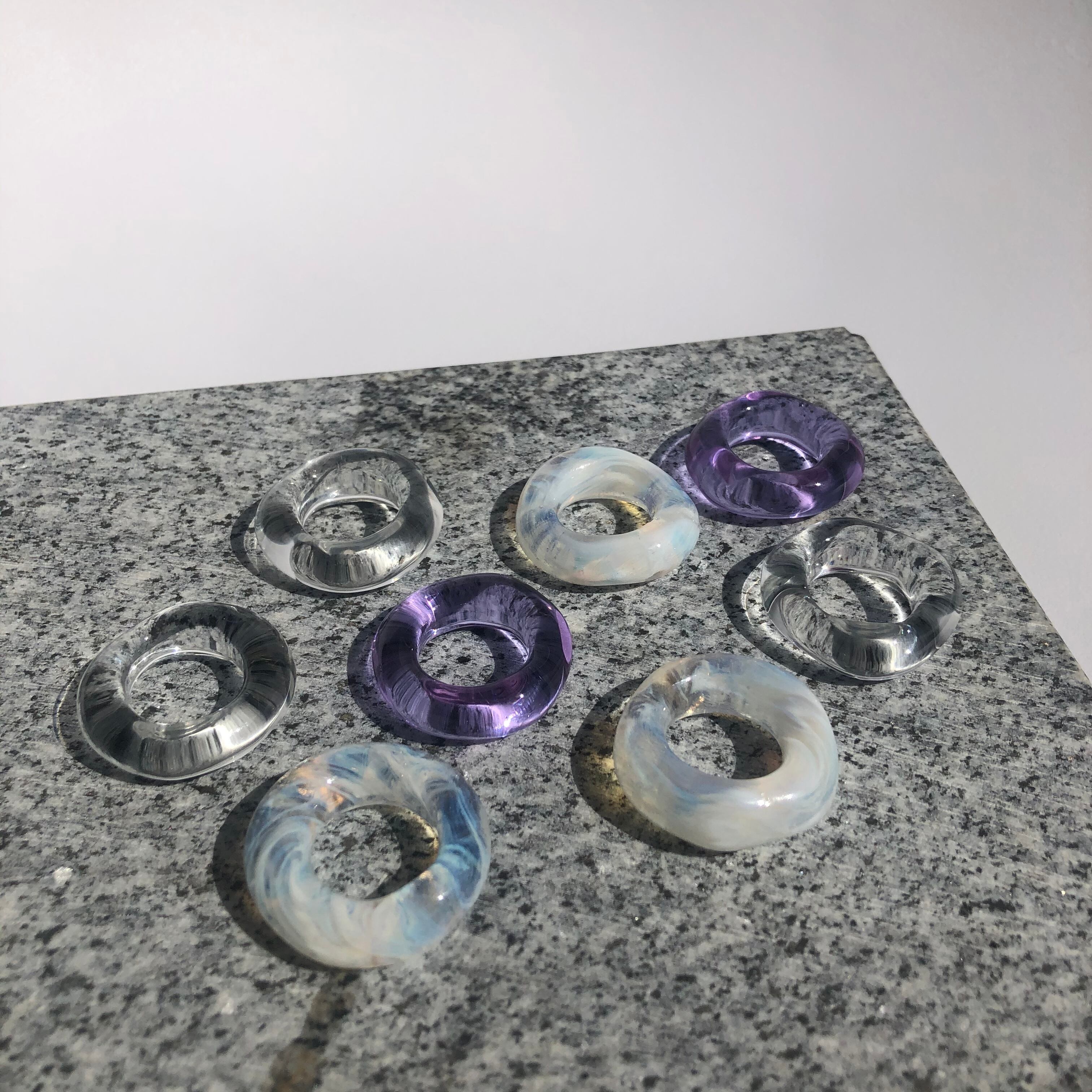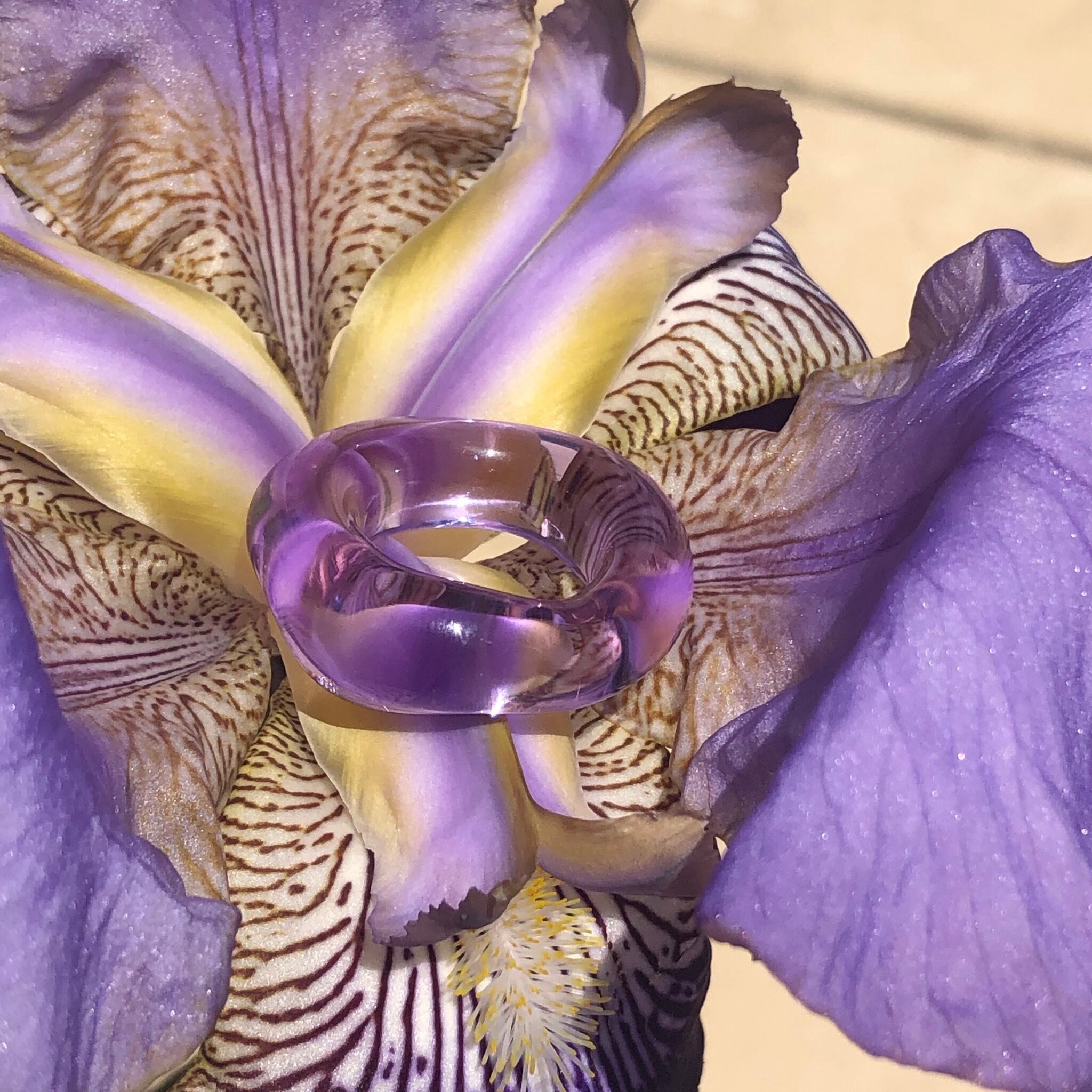 ガラスの特性上、太陽光ではパープル 蛍光灯の下ではブルーに見えます。 写真でご覧ください。 太陽の下では アイリスの花から生まれたような鮮やかなブルー 夕暮れにはブルーとパープルの混ざった グラデーションがとても幻想的♡ サイズは7〜19号までお作りできます。 10.12号以外の号数は その他 を選択後、 ご希望サイズを備考欄にお書きください。